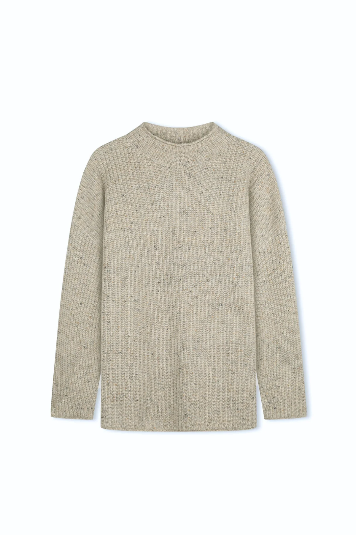 The Oat Marle Merino Wool Blend Knit Jumper boasts a high round neckline and dropped shoulder with rolled hemline detail. Crafted from a soft ribbed, speckled multi-tonal yarn, it features a harmonious blend of oat, black, and cream hues.